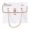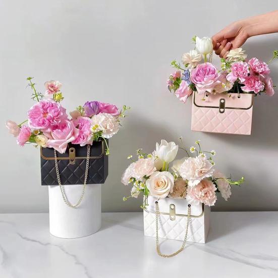 Elegantní design kabelky: Tato dárková krabička na květiny ve tvaru stylové kabelky kombinuje lehký papír a kovové prvky, aby vytvořila sofistikovanou prezentaci.. Třídimenzionální struktura umožňuje krásně vystavit květiny a zvyšuje vizuální přitažlivost jakékoli kytice elegantní, poutavou siluetou.