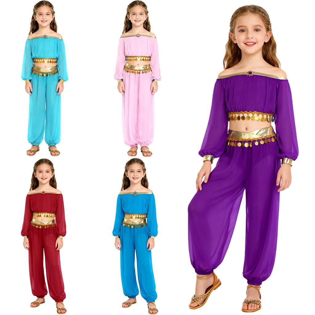 Dívčí kostým na břišní tance Sequin Tassel Top Kalhoty s všitými kalhotkami Zdobení kamínky Dlouhý rukáv