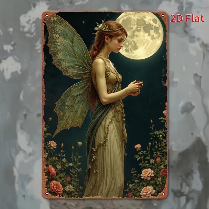 Rovná retro plechová cedule ve tvaru plechovky s tématem modré víly v měsíčním lese kovové umělecké dílo vysoce vhodné f