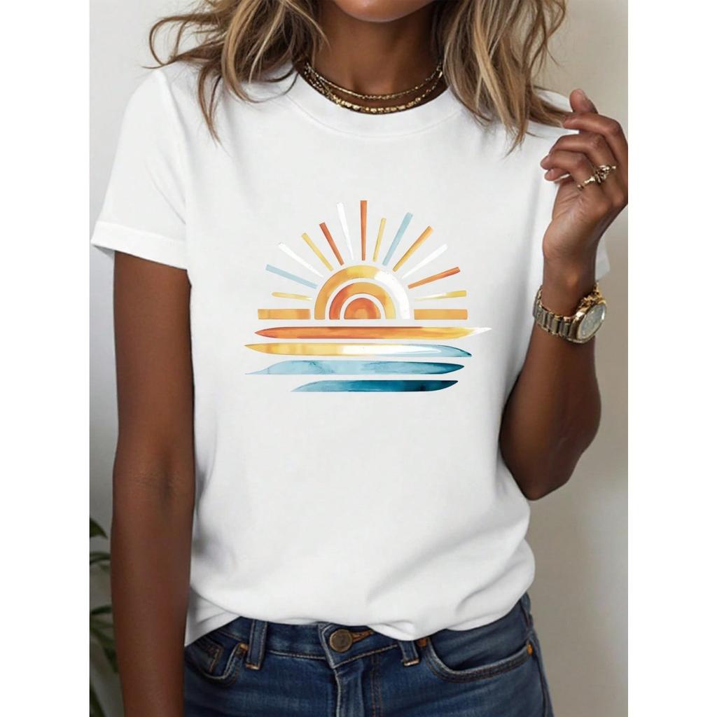 INAWLY Women's Sun Print Casual Versatile Round Neck Short Sleeve T-Shirt