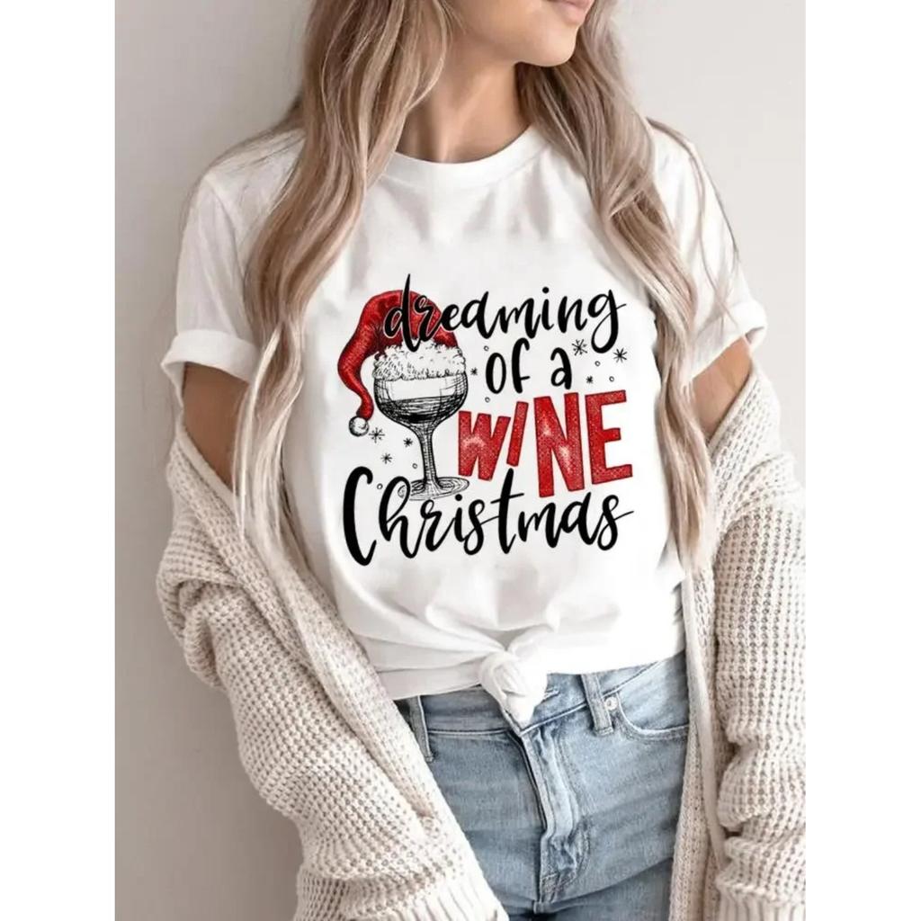 Merry Christmas Women Holiday Shirt Clothing Print T Top Wine Letter Sweet Graphic Tee Fashion Female New Year T-shirts