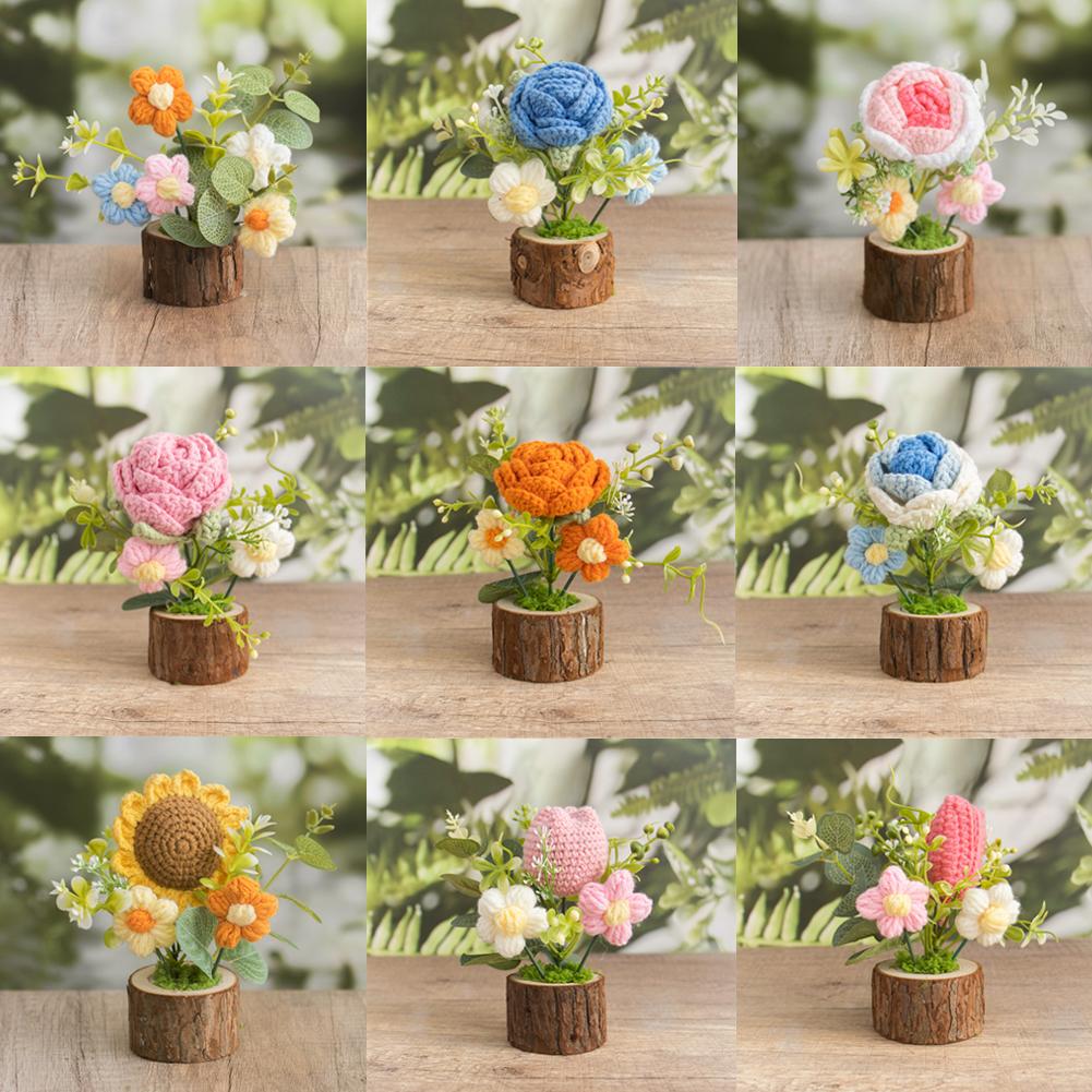 Hand-Knitted Rose Flowers Home Decoration Valentine's Day Gift Handmade Crocheted Flowers Bouquets flowerpot Desktop Ornament