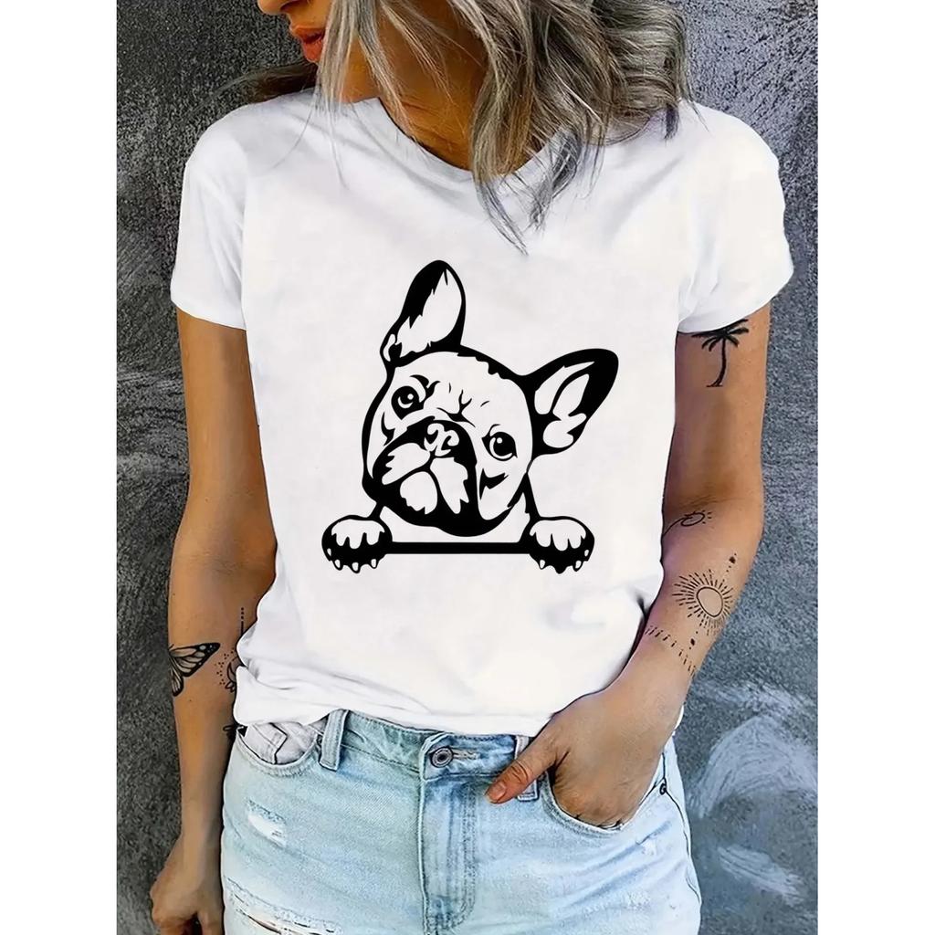 Summer & Spring Women's Clothing Dog Print T-shirt Sleeve Crew Neck Casual Aesthetic Clothes