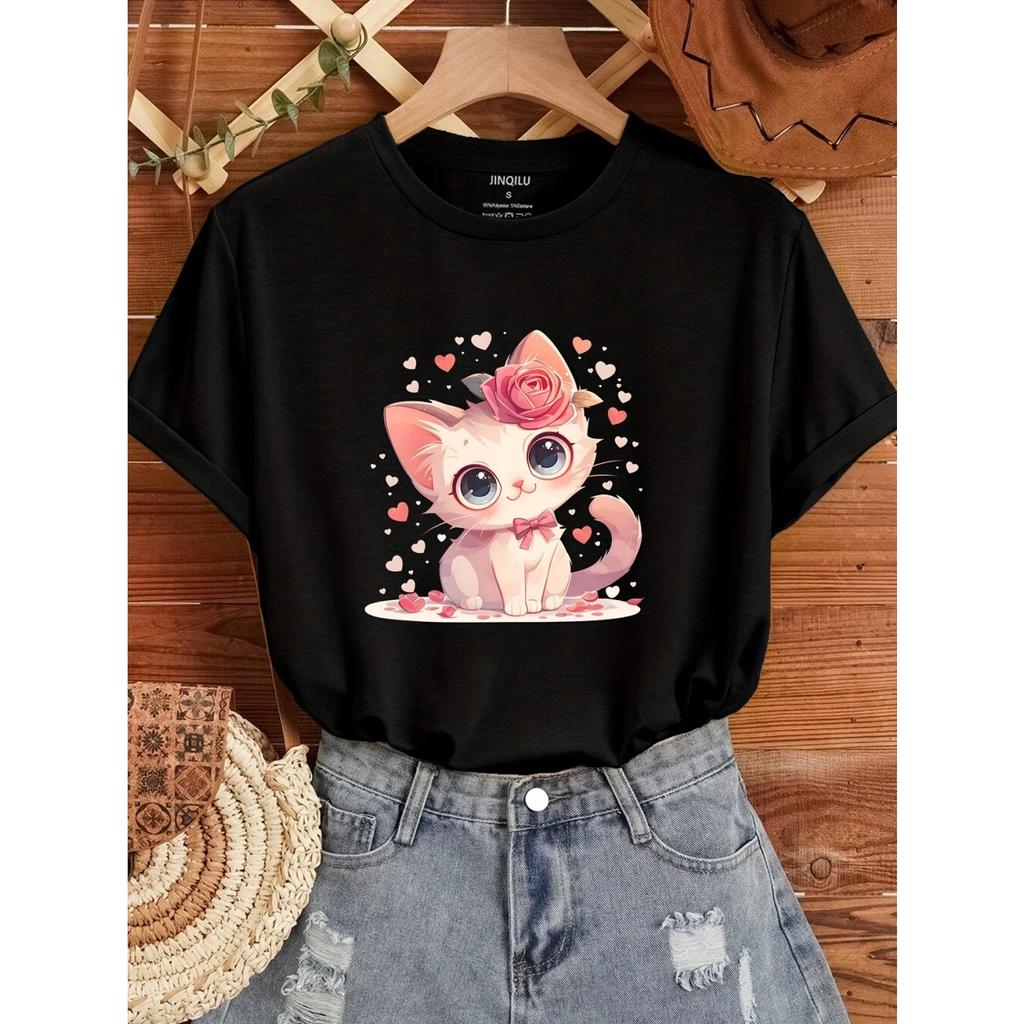 Cute Cat Print Crew Neck T-Shirt, Casual Short Sleeve Top For Spring & Summer, Women's Clothing