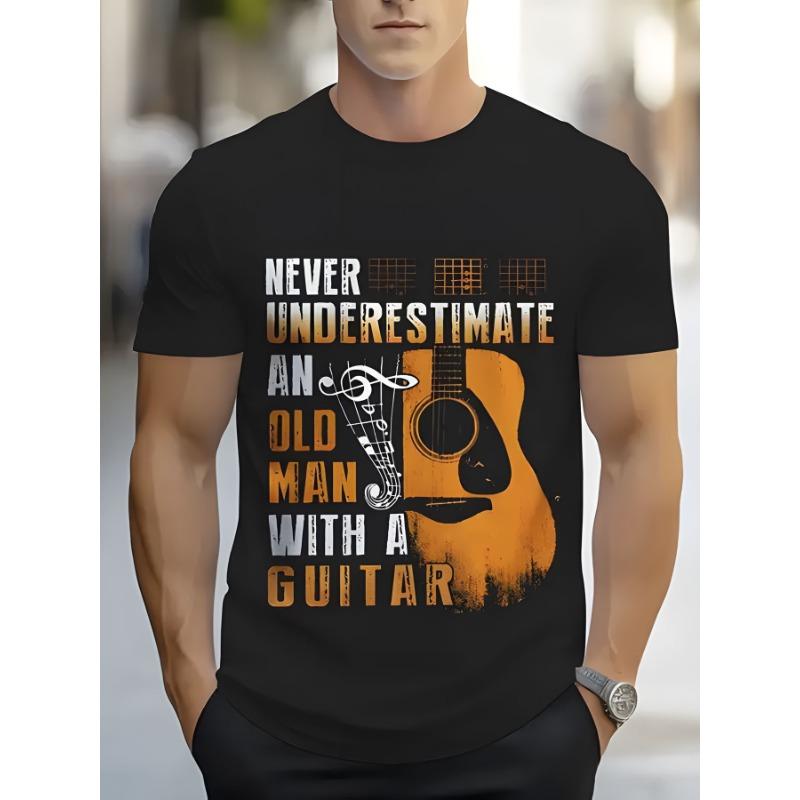 Mens Tshirt with printed notes and guitar patterns vintage band design suitable for musicians and music enthusiasts