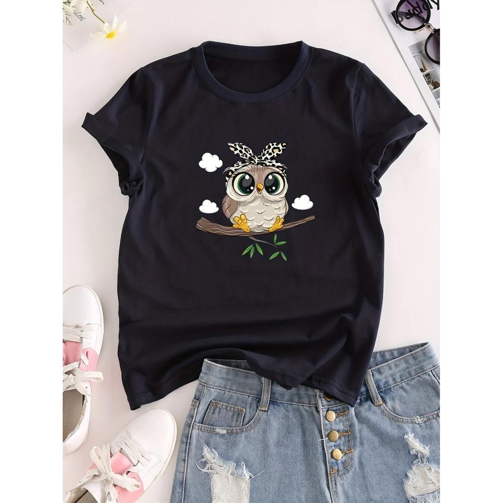 Kreslené Kawaii tričko s potiskem sovy, Krátký rukáv, Kulatý výstřih, Ležérní top na léto a jaro, Dámské oblečení