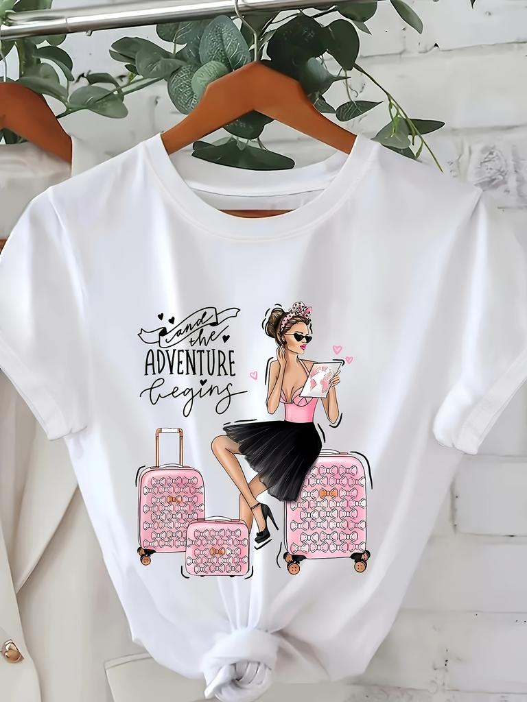 Evropská velikost Módní dámské tričko s kulatým výstřihem s potiskem písmen a kreslených postaviček | Jednoduchý design, Pohodlné a prodyšné