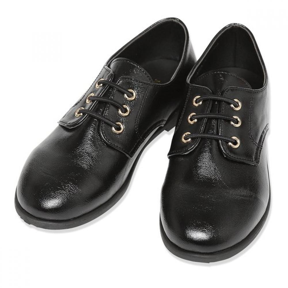 The BA11AF01BK Boys' Black Enamel Loafers are crafted from a soft black enamel material with a luxurious shine. They feature elastic laces for convenient wear and a cushioned sole for high comfort. Both the exterior and interior are unified in black, while metallic eyelets and logos provide a sophisticated touch in gold. This item is unisex and perfect for town styling.