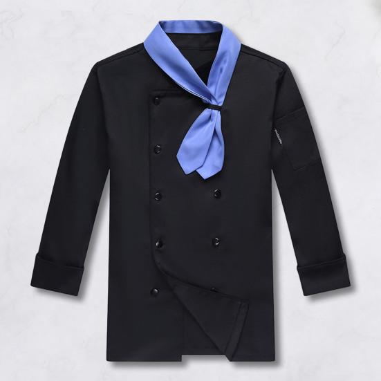 Funkční detaily pro pohodlí: Tento šéfkuchařský kabát, navržený s dvouřadými knoflíky, kapsami na rukávech s monogramem a lemem šálu, kombinuje styl s funkčností, aby bez námahy splnil požadavky vašich kulinářských úkolů.