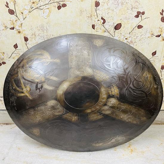1. Autentický design: Tento štít, vyrobený s přesností a důrazem na detail, zachycuje podstatu starověkého bojového vybavení. Starožitný mosazný povrch mu propůjčuje nádech autenticity, díky čemuž je ideální pro historické rekonstrukce, cosplay nebo výstavu.