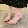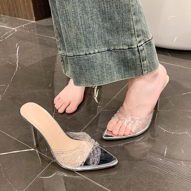 French niche pointed rhinestone high heel slippers thin heel sexy lady silver word with transparent sandals