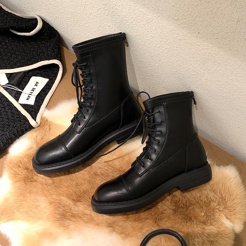 Leather short boots Martin boots women's new fashionable versatile winter velvet short tube flat-bottomed British style boots