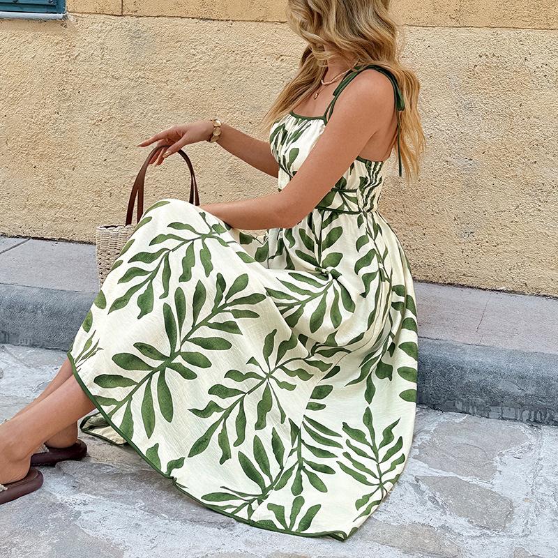 Summer New Style Light and Fresh Seaside Vacation Style Halter Dress with A Fitted Waist and Green Leaf Print Dress