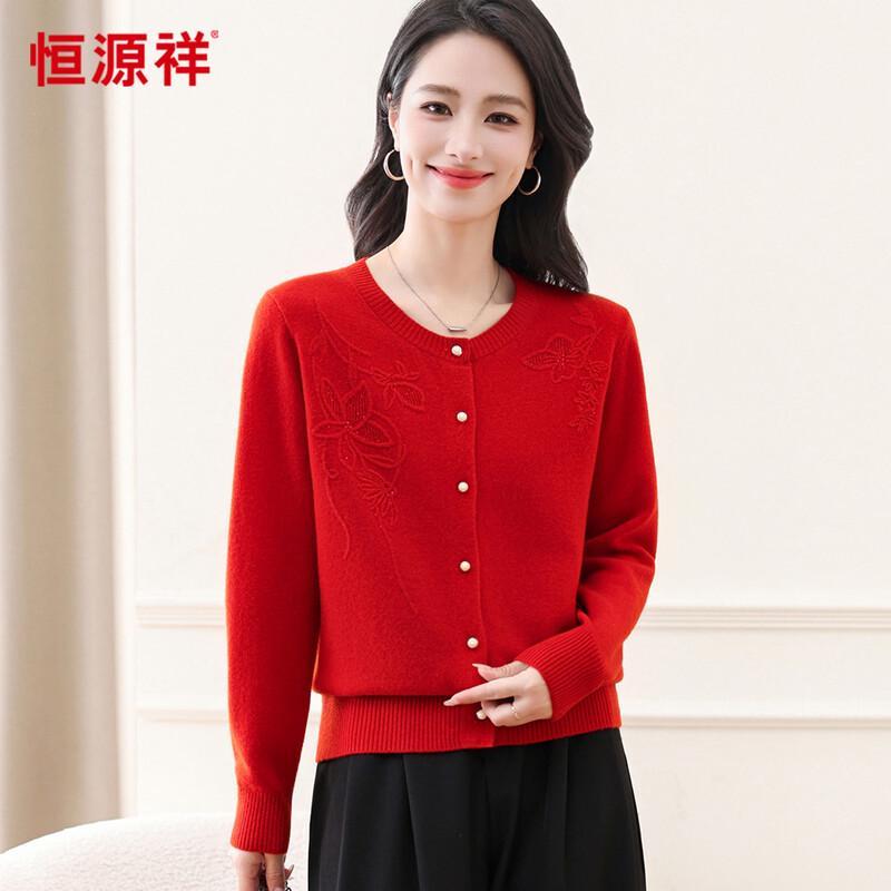 Hengyuanxiang Women's 100% Wool Retro Jacquard Rhinestone Cardigan