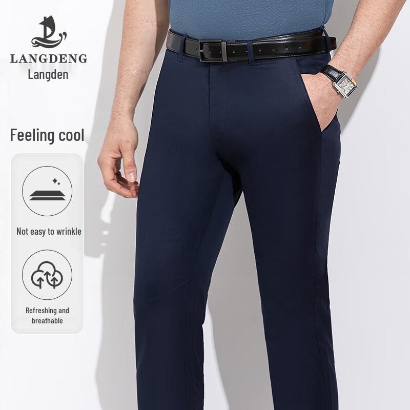 Langdeng Men's Summer Lightweight Stretch Straight-Leg Business Casual Trousers