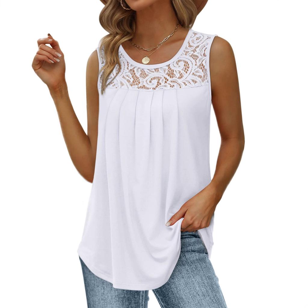 Women's Casual And Fashionable Color Sleeveless Lace Pleated Round Neck Top