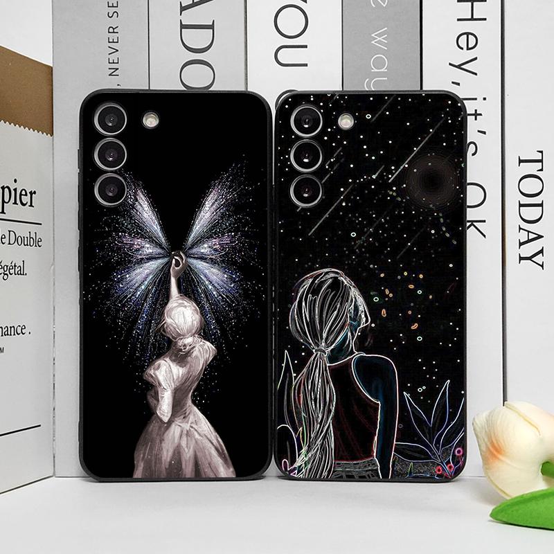 Creative Black Stardust Girl Pattern Phone Case for Samsung Galaxy S25 S24+ S23 Ultra S22 Plus S20 S21 FE M53 M34 5G Soft Covers