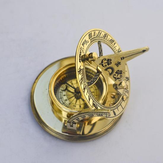 The magnetic compass helps identify direction (North, South, East, West), while the sundial demonstrates traditional time-telling using sunlight.