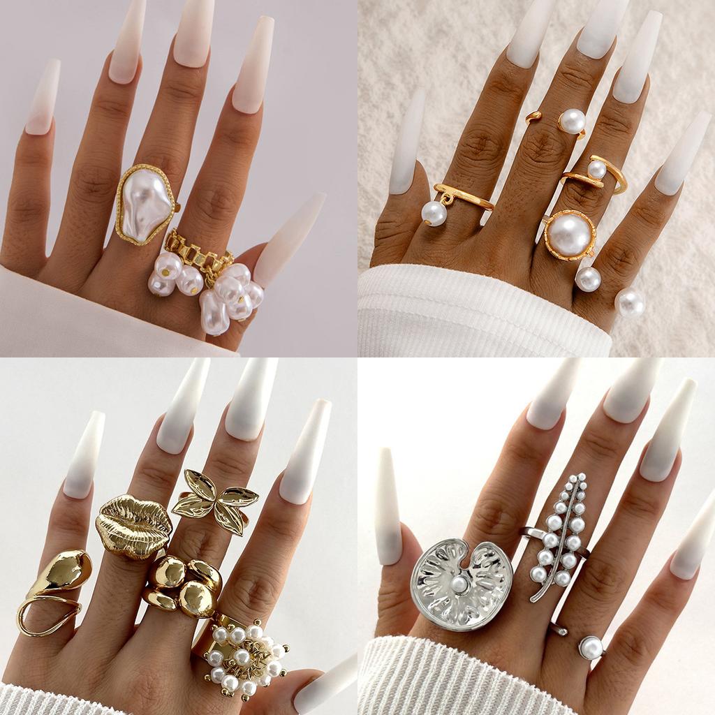Accessories, Baroque special-shaped hollow pearl ring, geometric pendant stacked iron ring set