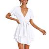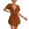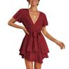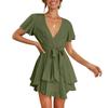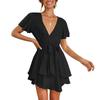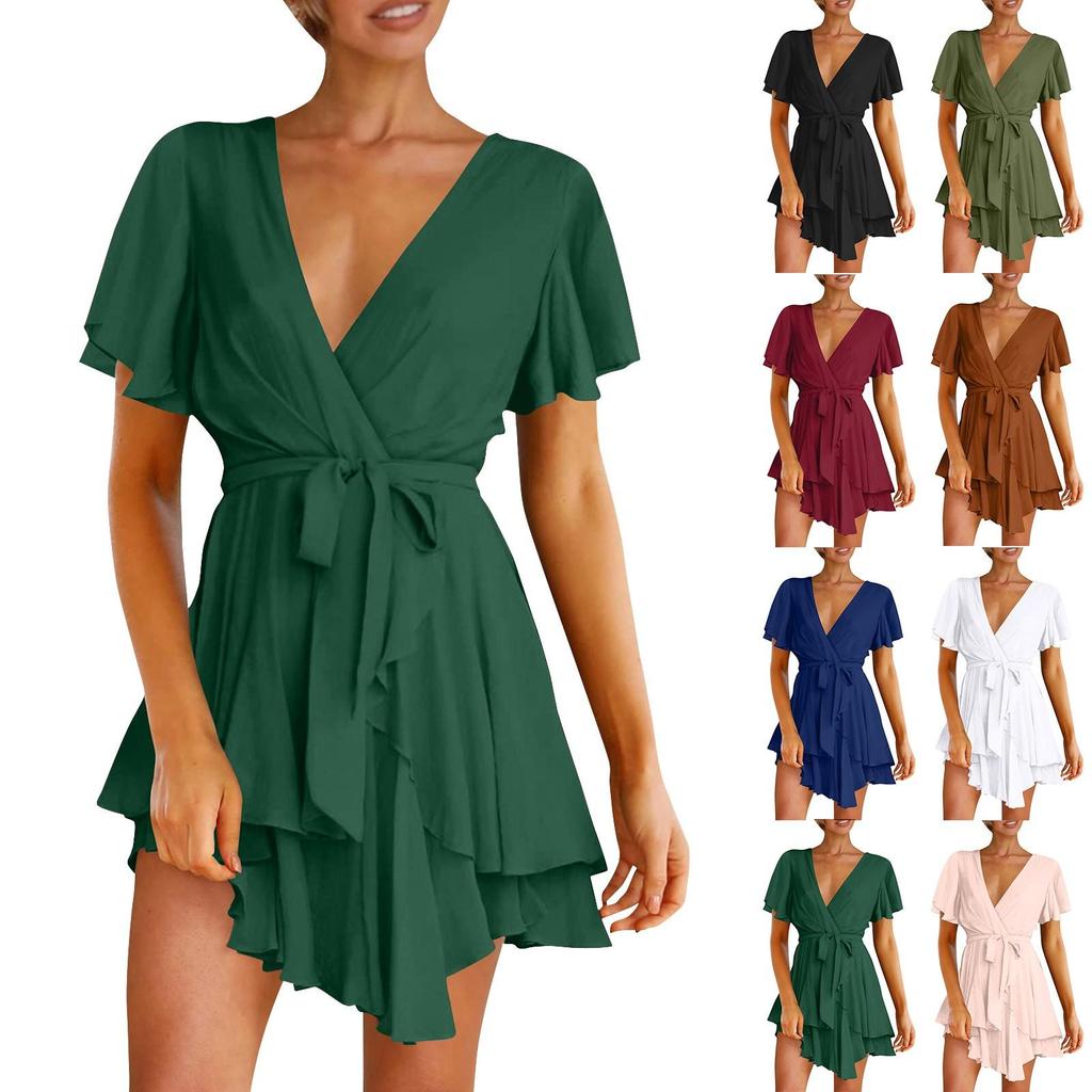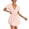 Dámské módní ležérní jednobarevné krátké rukávy s výstřihem do V, volný pas a volánky