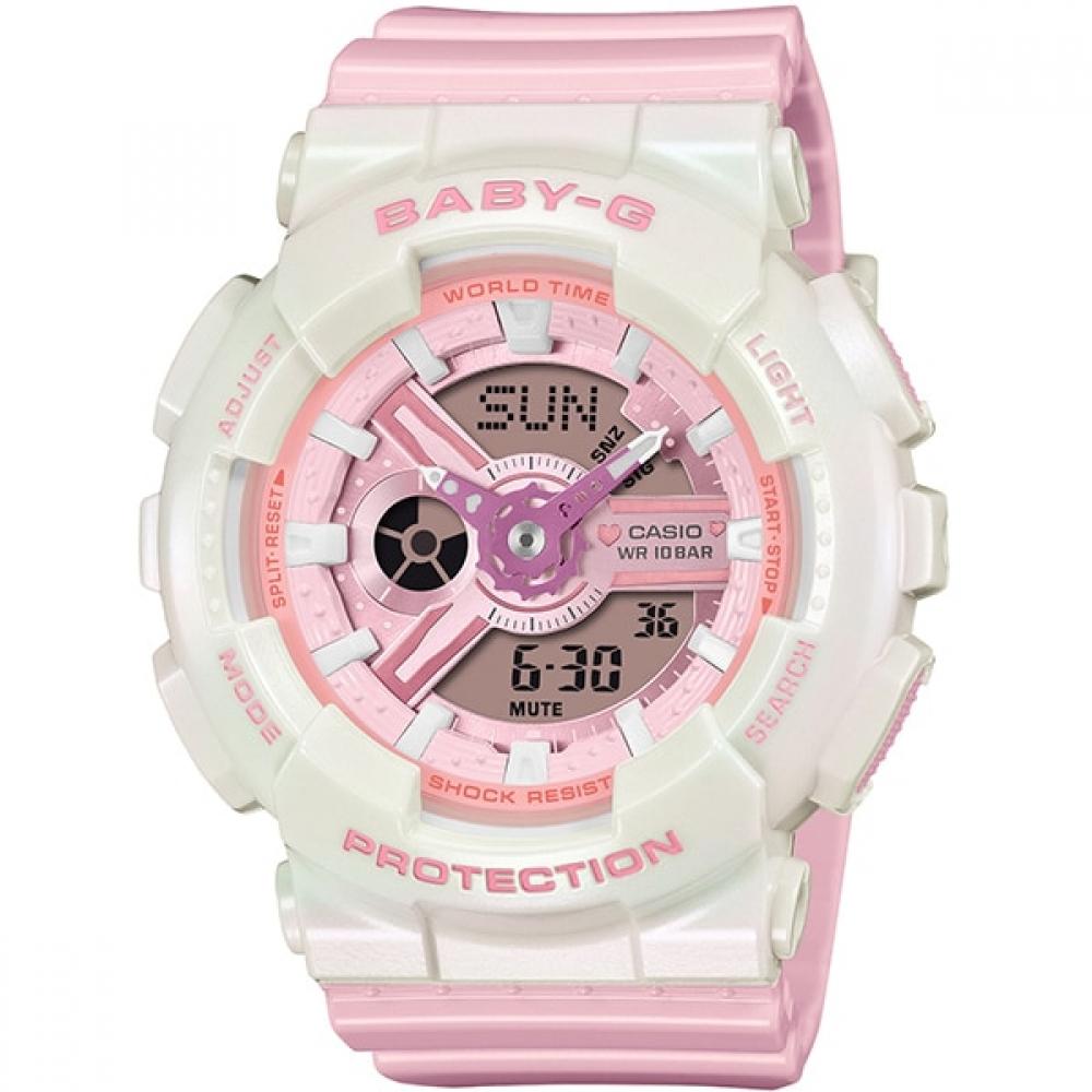 The CASIO Baby-G BA-110PD-4AJF is a shock-resistant and casual watch designed for active women. Its soft pastel color design brings vibrancy to everyday life. The complex combination design of the base model BA-110 refracts light across all parts of the watch, adding a sparkling effect. A heart-shaped metal part decorates the 3 o'clock position, completing the adorable design. Additionally, it boasts shock-resistant construction and 10 ATM water resistance features, making it reliable for daily life as well as sports and leisure activities.