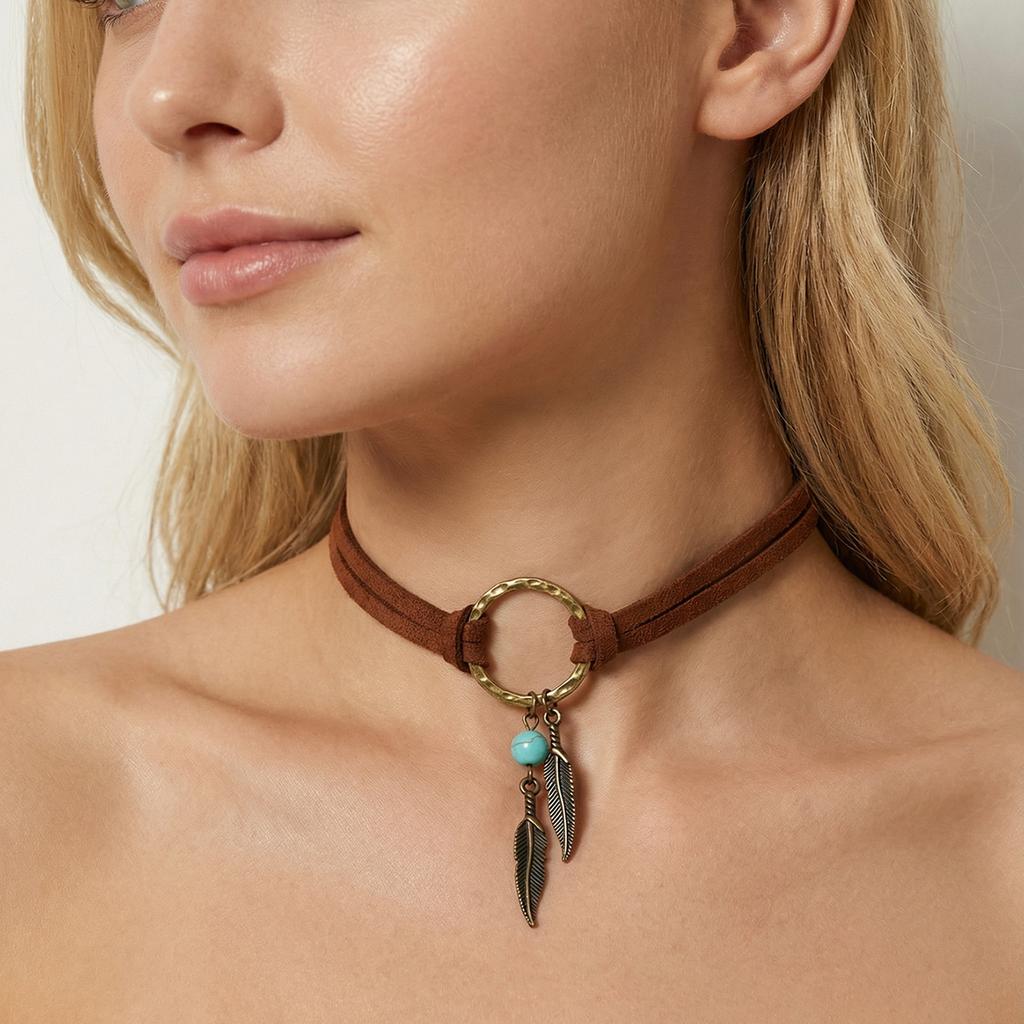 European and American retro jewelry, geometric circle Korean velvet necklace, leaf turquoise choker double necklace