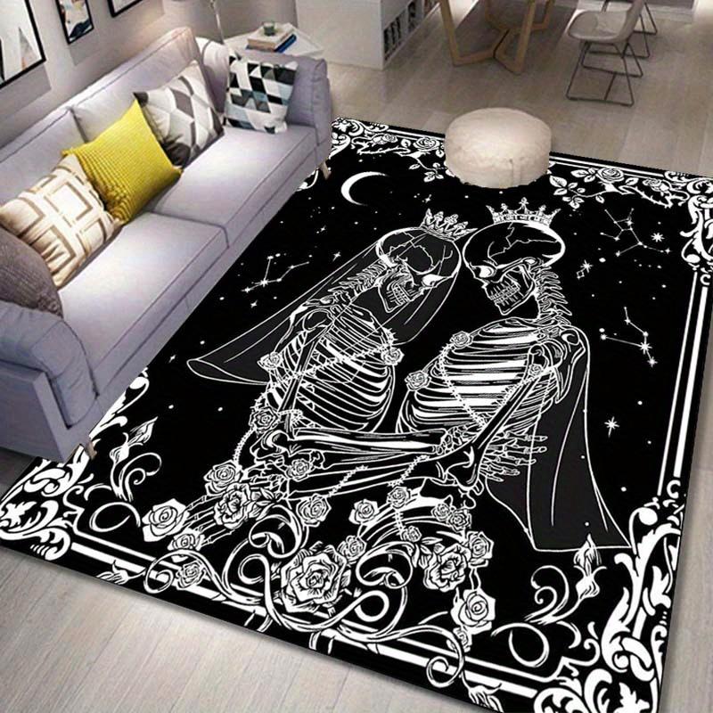 Romantic Skeleton CoupleRug forGothic WeddingDecorBlack and White Skull CarpetDark RomanceAnti slip carpet can be machine washed