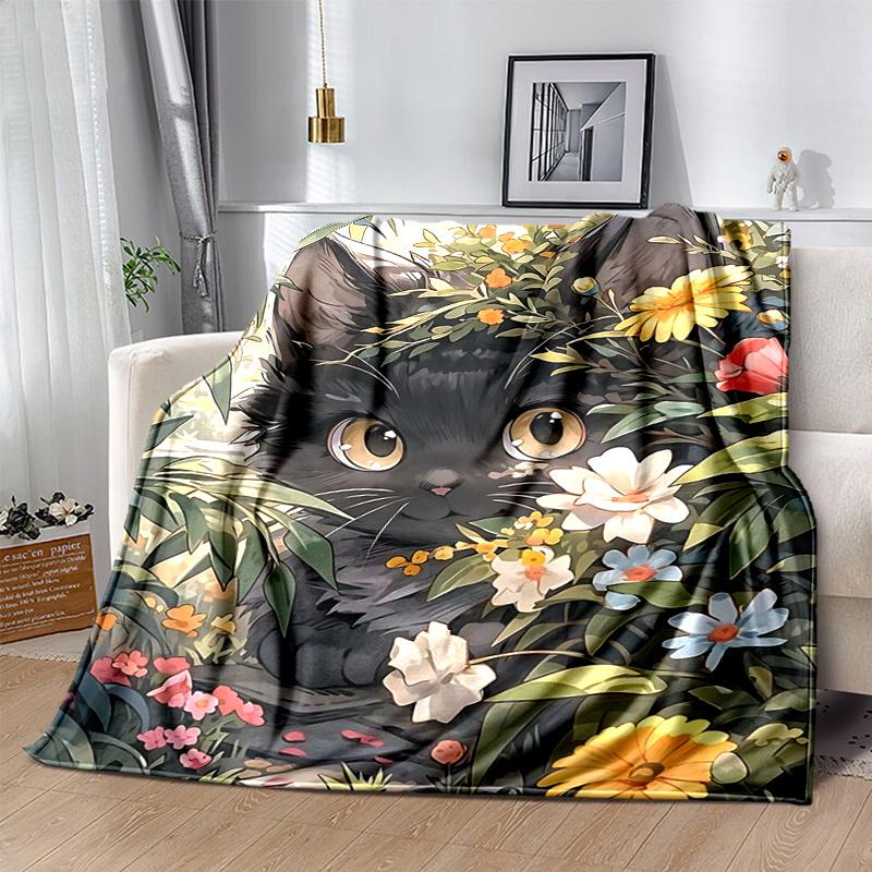 1pc Black Cat Flower Blanket Soft & Cozy, Perfect Gift for Any Occasion,Living Room, Travel, Camping, Car Blankets