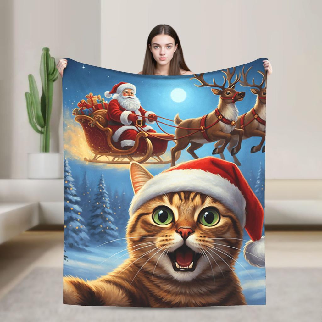 Cat Selfie with Santa Blanket Warm Comfortable Plush Throw Blanket For Kids Adult Living Room Flannel Bedspread Bed Cover