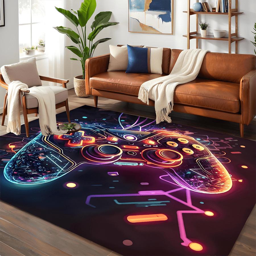 Flannel Printed Gaming Controller Rug Neon LED Design Soft Fleece Floor Mat Living Room Carpet Gamer Decor Tech Theme Rugs