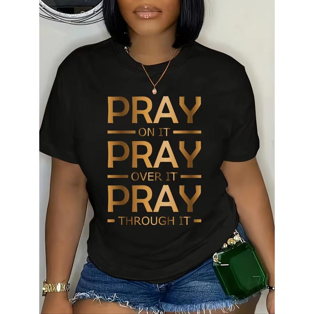 Pray Print Crew Neck T-shirt, Short Sleeve Casual Top For Summer & Spring, Women's Clothing