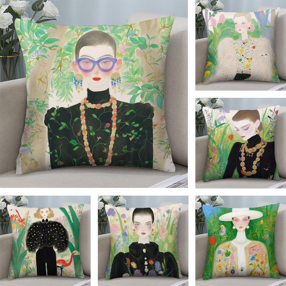 Fashion Illustration Cushion Cover Soft Plush Fabric Double-Sided Printed Sofa Cushion Cover for All Seasons Home Decor Gift