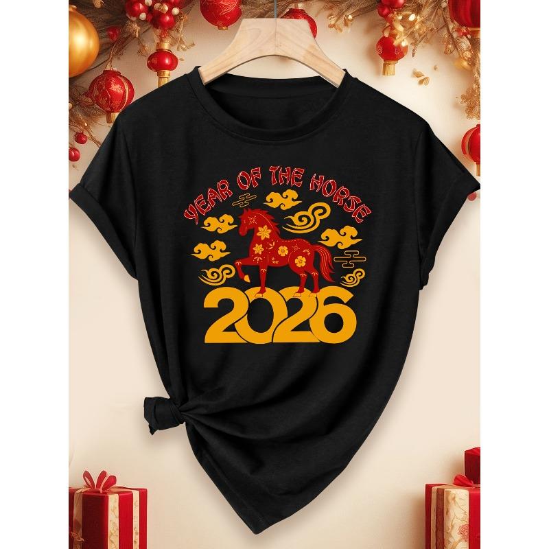 European Size T-shirt Year of The Horse 2026 Chinese New Year Design Red Horse Print Casual Fashion Gift for Women Holiday Gift Christmas Gift