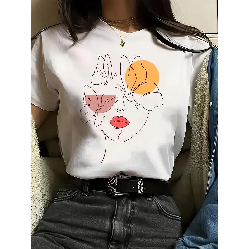 Women Summer Spring Graphic Print T-Shirt Crew Neck Short Sleeve Opaque Breathable Casual Versatile Machine Washable Top