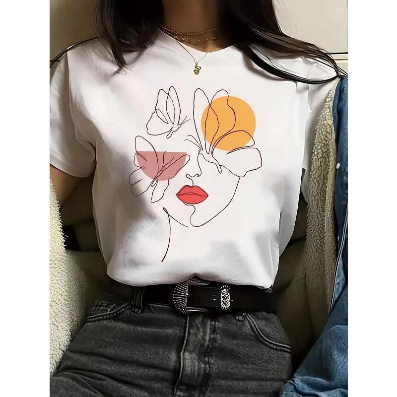 Evropská velikost Módní tričko s grafickým potiskem Krátký rukáv Kulatý výstřih Univerzální ležérní top Jaro Léto Dámské oblečení