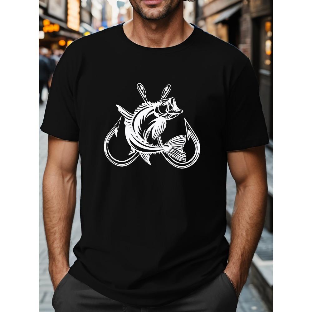 European sizes Men's Fish And Fishhook Print Creative Top, Casual Short Sleeve Crew Neck T-shirt, Men's Clothing For Summer Outdoor