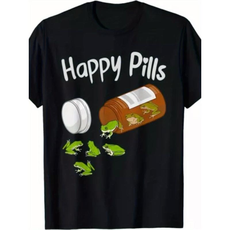 European sizes Men's Funny Happy Pills Frog T-Shirt - Retro Casual Short Sleeve Tee with Cute Frog & Pills Design, Comfortable Casual Wear