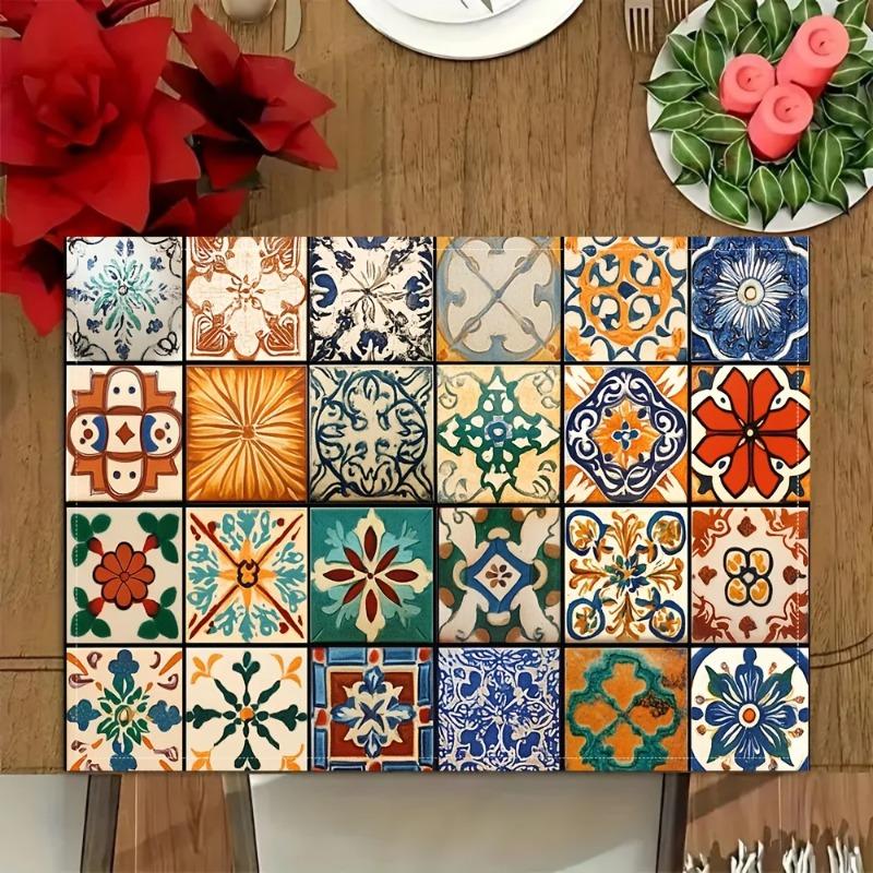 Contemporary Table Mats Set Multicolor Geometric Pattern Blue Orange Theme with Minimalist Tableware for Dining Room