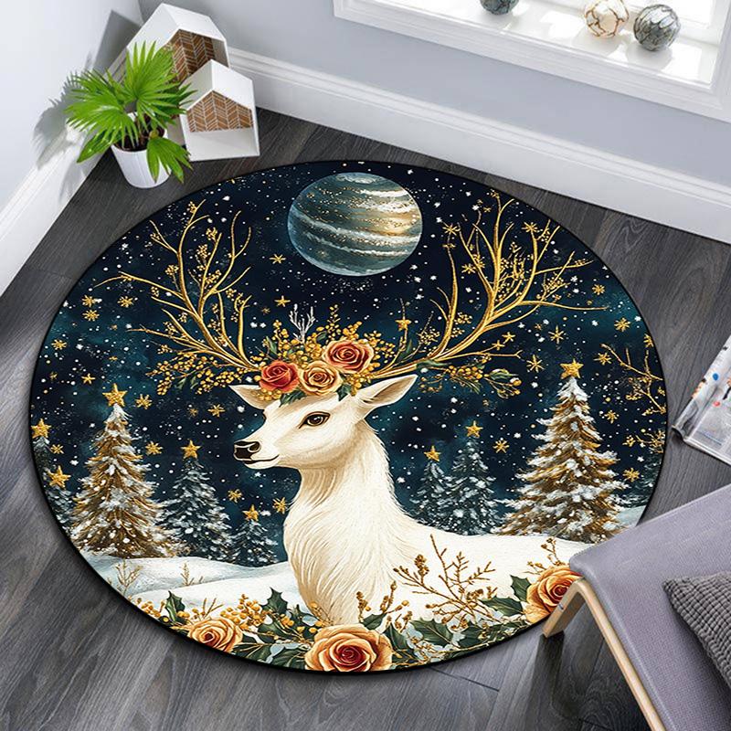 Winter Deer Round Area Rug,Carpet Rug for Living Room Bedroom Sofa Playroom Decor,Non-slip Floor Mat