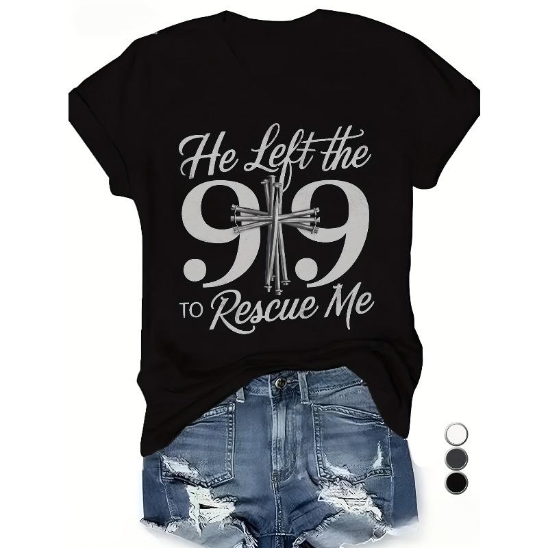 Womens Casual Loose Fit Crew Neck Cross Design He Left The 99 To Rescue Me Scripture Machine Washable Spring Summer Top
