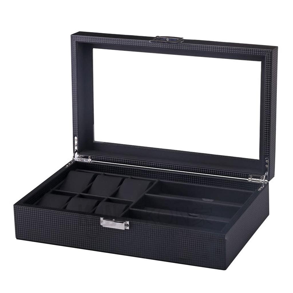 Hlavní tělo je vyrobeno z luxusní kůže s povrchovou úpravou z uhlíkových vláken, čímž vzniká luxusní, robustní úložný box, který úhledně uloží vaše drahé hodinky a brýle.. Úložný prostor je vyroben z měkké PU kůže pro ochranu vašich cenných hodinek.. Elegantní povrchová úprava a nízkoprofilová konstrukce z něj činí skvělou volbu pro ty, kteří si cení kvality.
