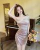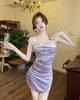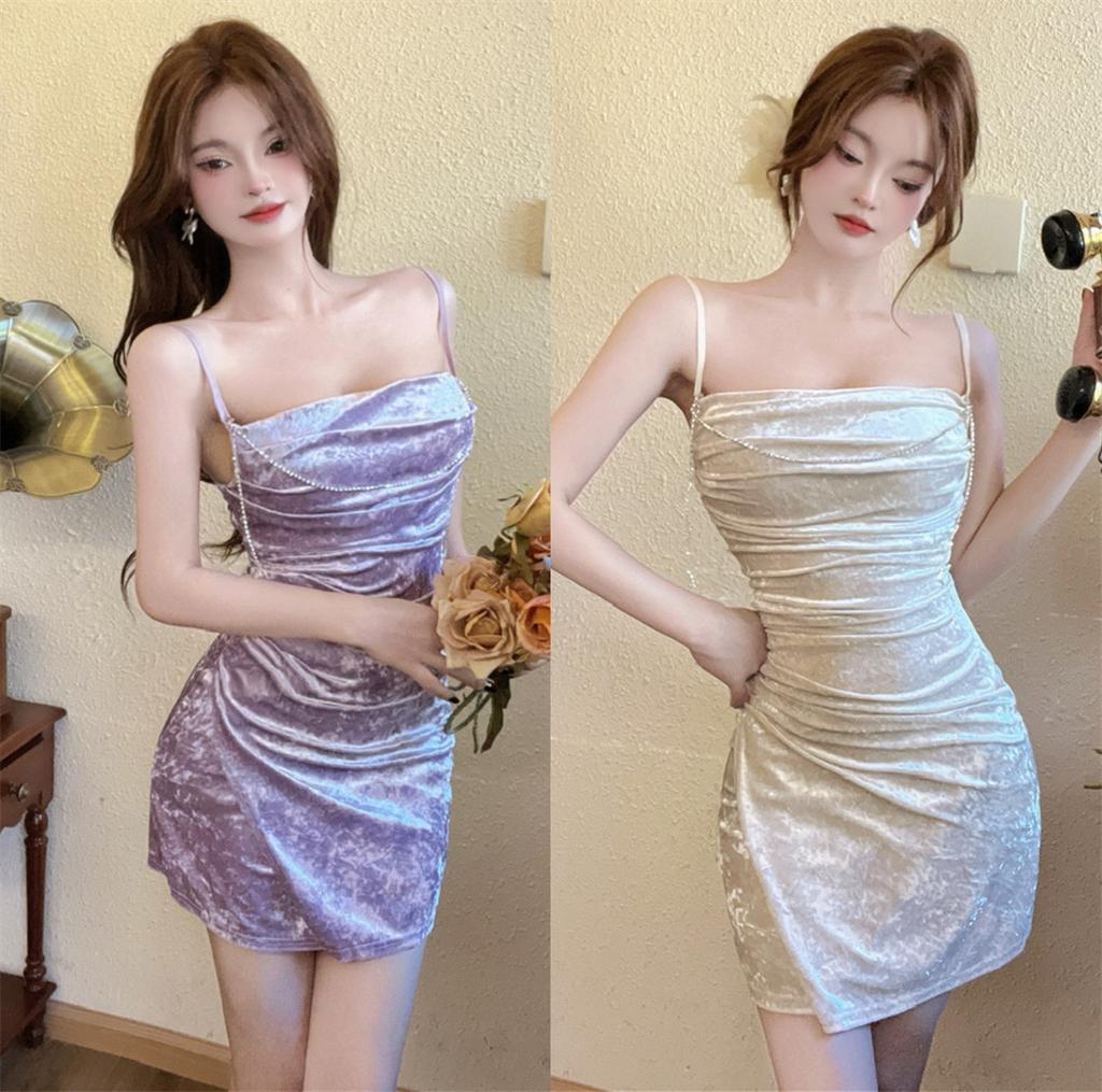 Temperament Golden Velvet Irregular Suspender Dress Nightclub Sexy Waist Pure Hip Wrap Bottom Dress