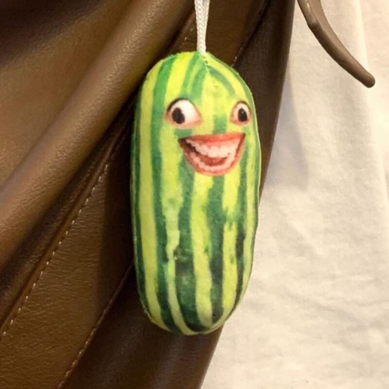 A cucumber watermelon keychain with gums that resembles you, a blind man