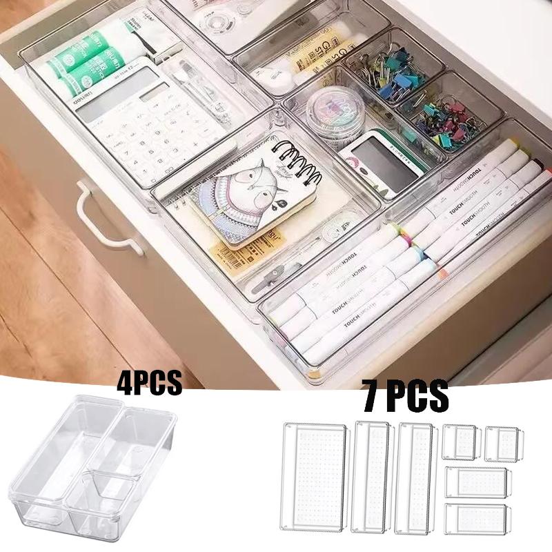 Versatile 7/14-Piece Drawer Organizer Set - Clear Plastic Dividers And Trays in 4 Sizes For Perfect Makeup And Kitchen Storage