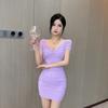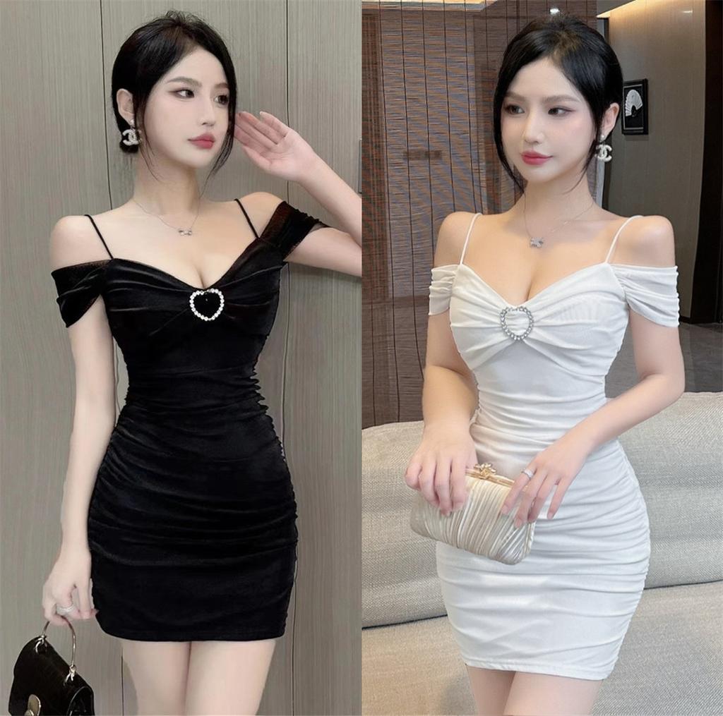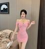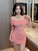 Sexy one-word collar mesh shoulder sleeves off-the-shoulder tight body hip-wrapped bottom short suspender dress new
