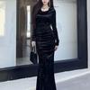 2025 Autumn/Winter Elegant Velvet Fishtail Dress with Pleated Swing Collar and Long Sleeves