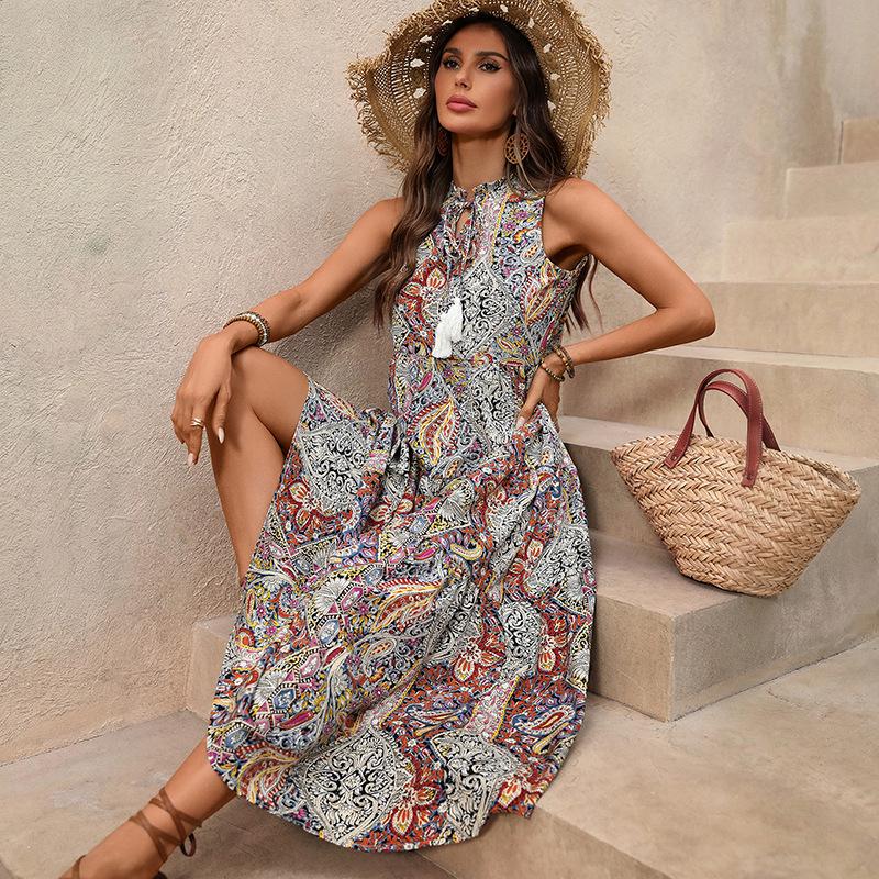 Elevate your resort wardrobe with this stylish sleeveless tassel dress, designed with inspiration from popular TikTok trends. Crafted from high-quality polyester, this dress offers both comfort and durability, perfect for vacation getaways. The European and American resort style is accentuated by playful tassel details, adding a chic and fashionable touch to your look. Ideal for warm days and evenings, this dress seamlessly blends trendy aesthetics with practical wearability.