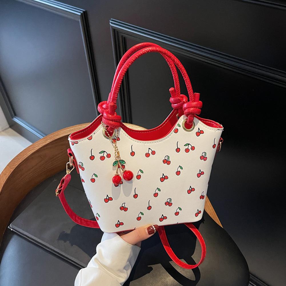 Leather Bucket Cherry Printed Crossbody Bag for Women Girls Stylish Small Tote Handbag Zipper Satchel Bag with Adjustable Strap