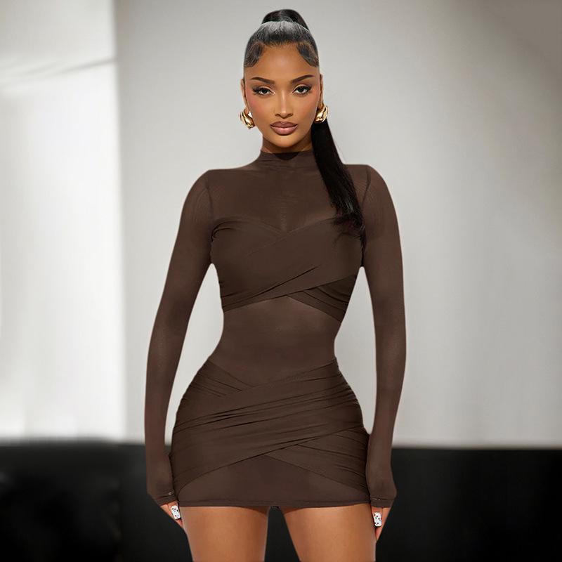 Sexy Round Neck Long Sleeve Mesh Patchwork Dress - Women's Autumn/Winter European & American Style