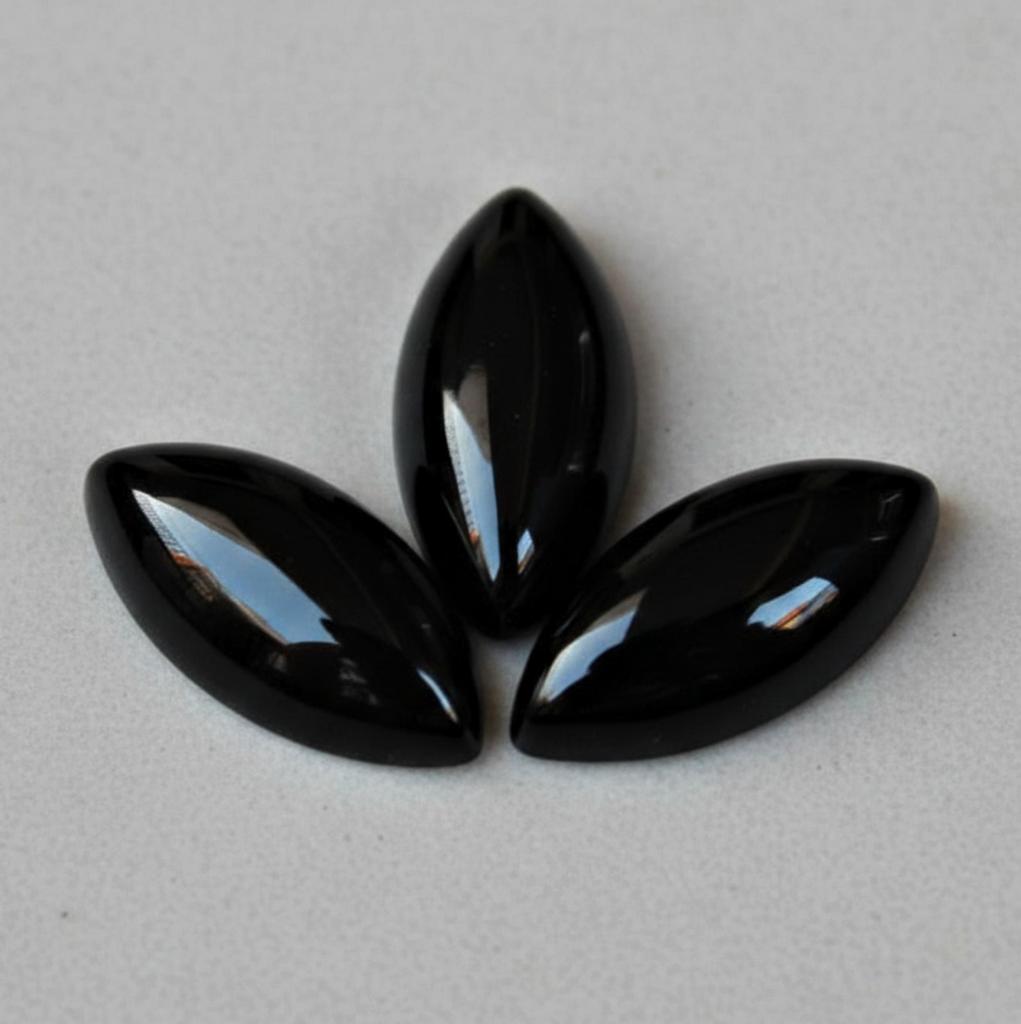 Black onyx marquise cabochons featuring deep black color and a smooth polished flatback finish. Elegant calibrated onyx gemstones ideal for rings, pendants, earrings, and bold handmade jewelry designs. A classic choice for jewelry-making supplies, offering sleek style and timeless appeal.